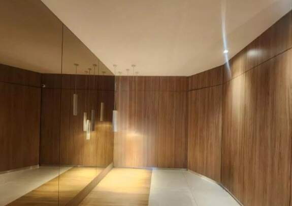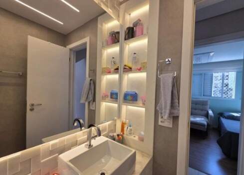 Ampla suíte com piso em porcelanato, armários, painéis, estante, ar condicionado, lavabo, lavanderia com armários.