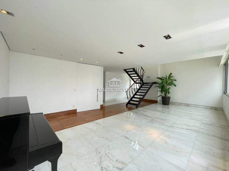 Uma cobertura de aproximadamente 575m² na Savassi reúne amplitude, elegância e conforto em 02 pavimentos bem distribuídos. No 1º nível, a sala para 02 ambientes em mármore claro integra-se a 03 quartos espaçosos, incluindo 01 suíte com closet e acabamento em mármore. A cozinha ampla conta com granito preto, armários planejados e coifa em inox, além de despensa, banheiro social refinado, DCE e área de serviço.